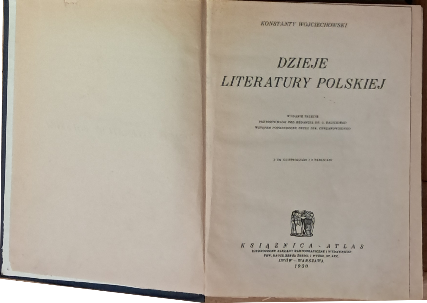 Oferujemy oryginale, trzecie wydanie „Historii literatury polskiej” z roku 1930, przygotowane przez wybitnego historyka literatury, profesora Uniwersytetu Jana Kazimierza we Lwowie, Konstantego Wojciechowskiego. Dopełnieniem znakomitego tekstu są liczne czarno-białe fotografie nie tylko opisywanych pisarzy ( portrety ) ale także stron tytułowych pierwodruków ich dzieł.